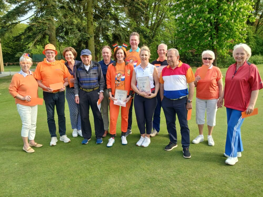 Onder een oranjezonnetje en een in oranje ornaat gestoken deelnemersveld is op Koningsdag de jaarlijkse vlaggetjeswedstrijd gespeeld. Wie kan met alle gegeven slagen (72 + playing Handicap) na de laatste slag zijn vlag zover mogelijk ritueel in de baan planten? De ene groep startte vanaf hole 1 en de andere vanaf hole 10. Voor sommige deelnemer is deze strokeplay meer een bijltjesdag dan vlaggetjesdag, maar dat mocht de pret niet drukken. De prijs voor de meest koningsgezinde kleding ging dit jaar naar Willy Nies en Hans Jorna.